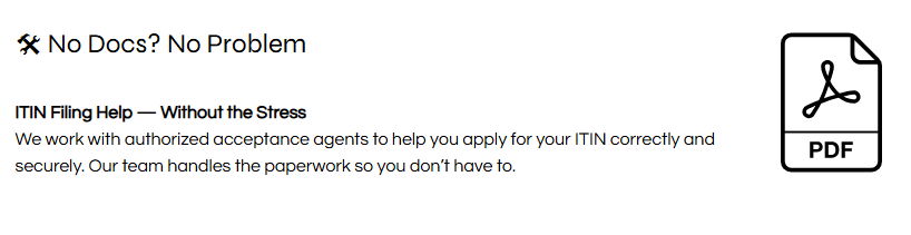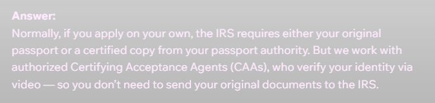 Your dedicated Certified Acceptance Agent will guide you through every step and carefully review your application to reduce the risk of rejection. You won’t need to mail your passport — Certified Acceptance Agents are authorized and trained by the IRS to verify and accept your documents directly.